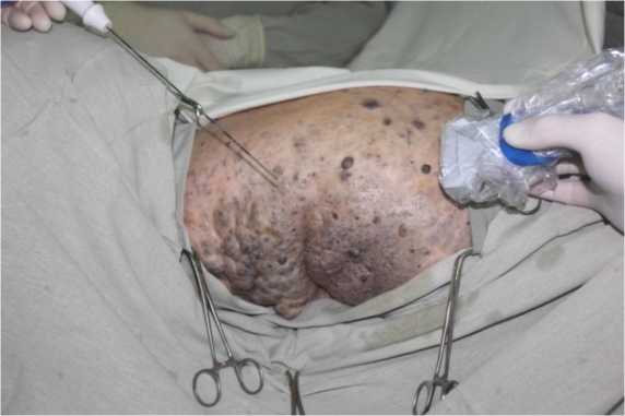 Fig. 4. Introduction of a radiofrequency catheter with UV control into the thickness of angioma-tous tissues in the buttock region