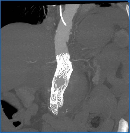 Рис. 1. КТ-ангиография после имплантации аортальной манжеты при эндолике Ia типа. Примечание: КТ — компьютерная томография.