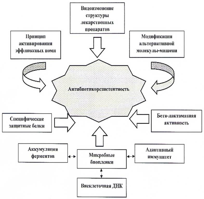 An analysis of domestic and foreign sources showed that a significant role in the development of ABR in microorganisms is assigned to enzymatic beta-lactamase activity, specific protective proteins of microorganisms, as well as the ability of pathogenic strains to form biofilms. Besides, according to the results of studies, the main source of resistance genes is the environment, where the transfer of ABR genes between representatives of different bacterial taxa occurs. Promising areas in the fight against antibiotic-resistant pathogens are mathematical modeling, synthetic biology, phage therapy.