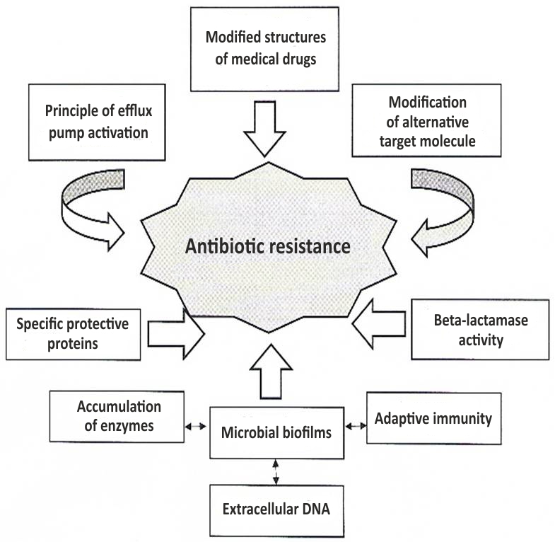 In modern studies, the antibiotic resistance tendency among microorganisms presents a serious evolutionary and ecological problem. The uncontrolled and unjustified current use of antibacterial drugs in medicine, veterinary medicine and agriculture provoked the activation of the mechanisms of bacterial cell defense known by the moment (activation of the efflux pumps, modification of the medical drug structure, modification of an alternative target molecule, microbial biofilms, etc.), and caused enhancement of the adaptive capacity of bacterial pathogens and dissemination of multidrug resistant strains.