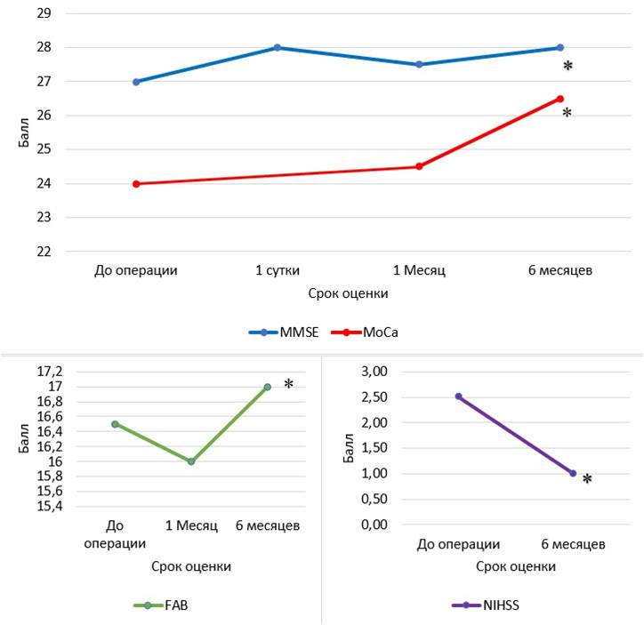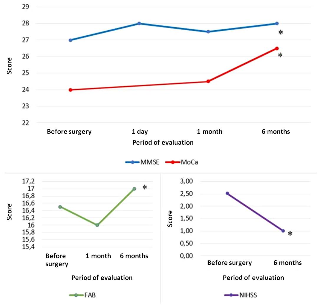 Cognitive testing in different periods before and after surgery showed improvement of the cognitive status of this group of patients on MMSE scale (p = 0.001) and MoCA-test (p = 0.09) by the 6th month relative to the initial data; on FAB scale relative to the data after 1 month (p = 0.01, Figure 1). At the same time, a decrease in the level of neurological deficit on NIHSS was noted (p = 0.01). On the whole, the increment was 1 point on MMSE, 2.5 points on MoCA and 1 point on FAB, but there was 1.5 point reduction on NIHSS scale, which reflects improvement of the cognitive status in this group of patients after surgical intervention.