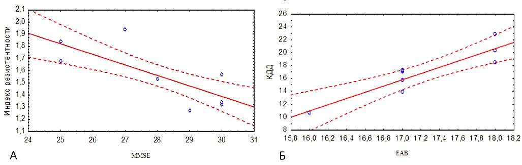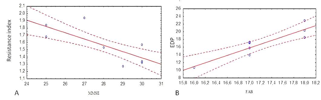 Considering a group of patients with a history of cerebrovascular accident, we found a reliable improvement of the cognitive status on all the studied scales (MMSE, FAB, MoCA-test, NIHSS) in the long-term period. It is difficult to say whether this is associated with the period of restoration of cerebral circulation after a cerebrovascular accident or with improvement of perfusion after CEA. Similar data were obtained by C. Baracchini, et al. (2012). They evidence improvement of the cognitive status in patients above 65 with an acute cerebrovascular accident in history and a significant lesion of the carotid artery, who underwent CEA. Patients with symptomatic stenoses showed a significant improvement of the average parameters of cognitive functions on MMSE and MoCA tests in 3 and 12 months, respectively [18]. Besides, in such patients, a relationship between neurophychic testing and ultrasound data should be noted: EDP and RI. Ultrasound parameters reflect a degree of brain perfusion directly related to the performed intervention. Similar data are reflected in the work of А. Nakamizo, et al. (2020), where the interrelation was shown between EDP and pulsation index in the common carotid artery and the level of neuropsychic status of patients after CEA [19].