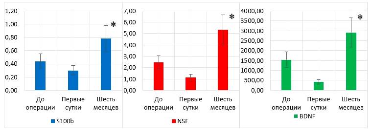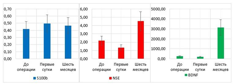 Fig. 5. Dynamics of biochemical parameters of the cerebral tissue (protein S100b, pg/ml; NSE, ng/ml; BDNF, pg/ml of plasma).