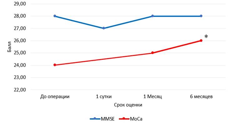 Notes: : MoCA-test — Montreal Cognitive Assessment, MMSE — Mini Mental State Examination; * — р < 0.05 — statistically significant differences compared to the initial level.