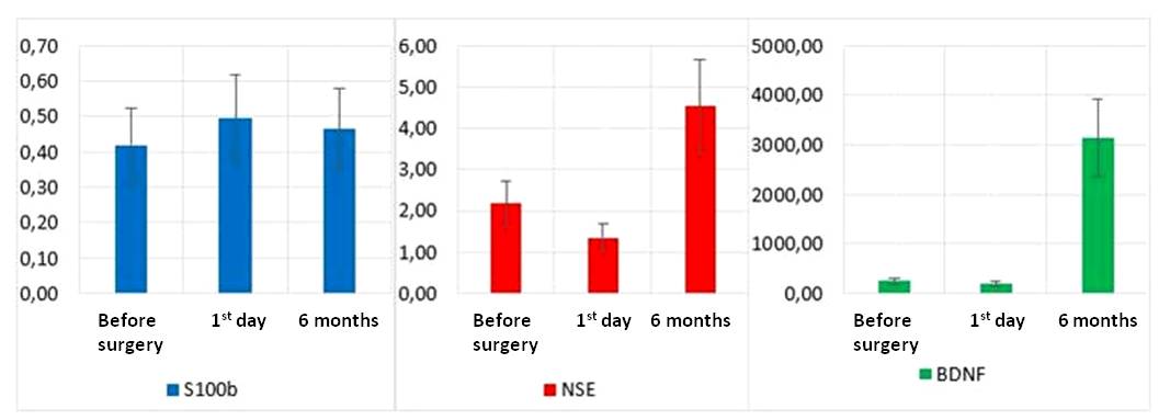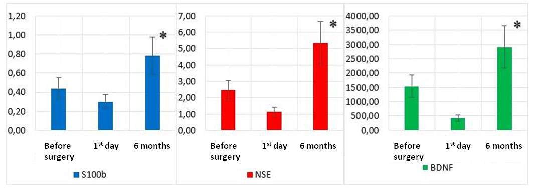 Considering the biochemical parameters, it was found that in 6 months after surgery, the S100b (p = 0.01) and NSE (p = 0.02) markers increased twice, and BDNF protein increased 1.5 times from the initial values (p = 0.005). As for NSE marker, it increased 4-fold by the 6th month relative to the values on the 1st day after the intervention (p = 0.005; Figure 5). These changes are rather ambiguous, S100b and NSE are markers of damage and appear in the peripheral blood only in case of disorders of the blood-brain barrier, which can be associated or not associated with damage to neurons. As for BDNF, it is a parameter of the restoration of the functions of neurons and glia. In our opinion, the detected changes should be considered as processes occurring in parallel, including damage due to chronic cerebral ischemia and restoration with replacement of the lost functions of a number of nerve cells.