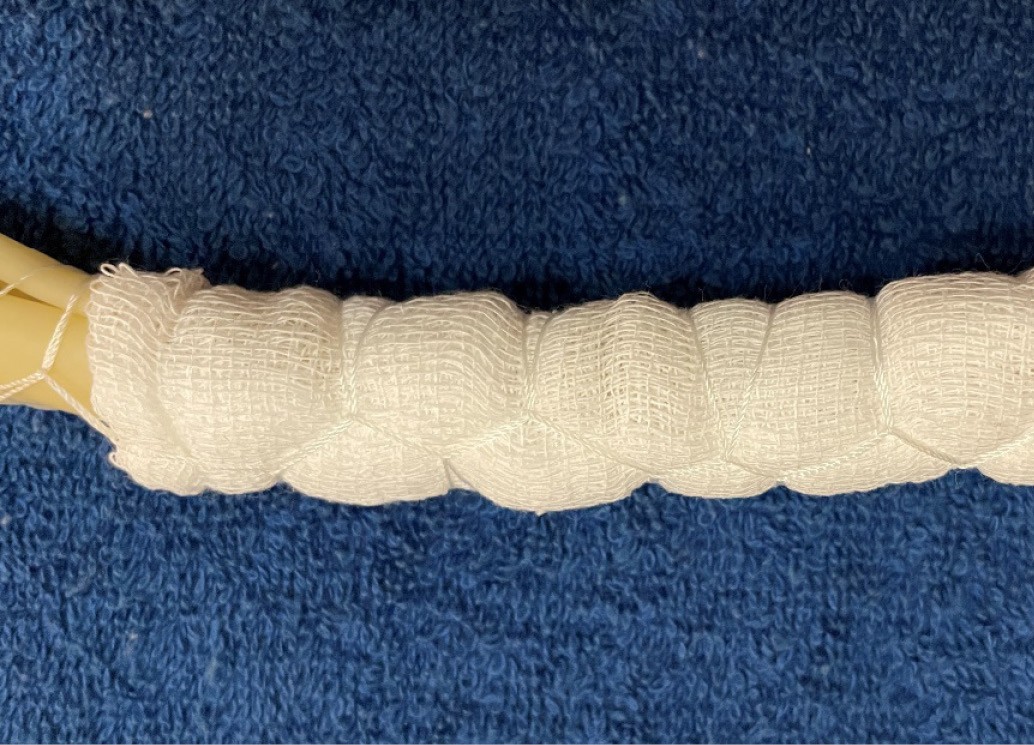 Fig. 1. A probe for chemical and mechanical hemostasis developed by the author's team: a gauze wad fixed with a chain suture on the esophageal cuff of the obturator probe.