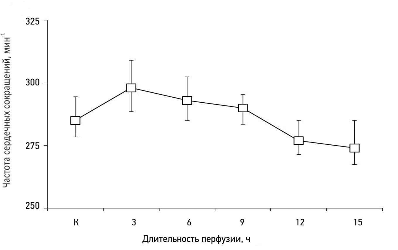 После 30 мин перфузии и стабилизации функции сердца ЧСС составляла 285,0 [278, 5; 294, 5] мин-1, в течение всего периода перфузии ЧСС оставалась в пределах физиологических значений без статистически значимых изменений, через 12 и 15 часов перфузии отмечалась тенденция к некоторому урежению ЧСС (рис. 2).