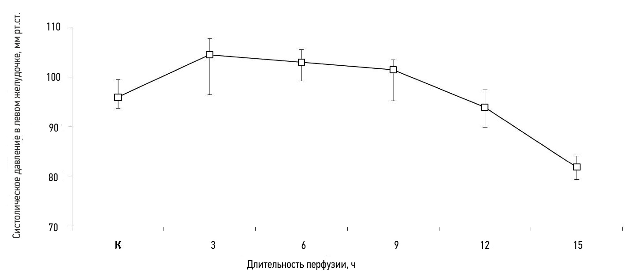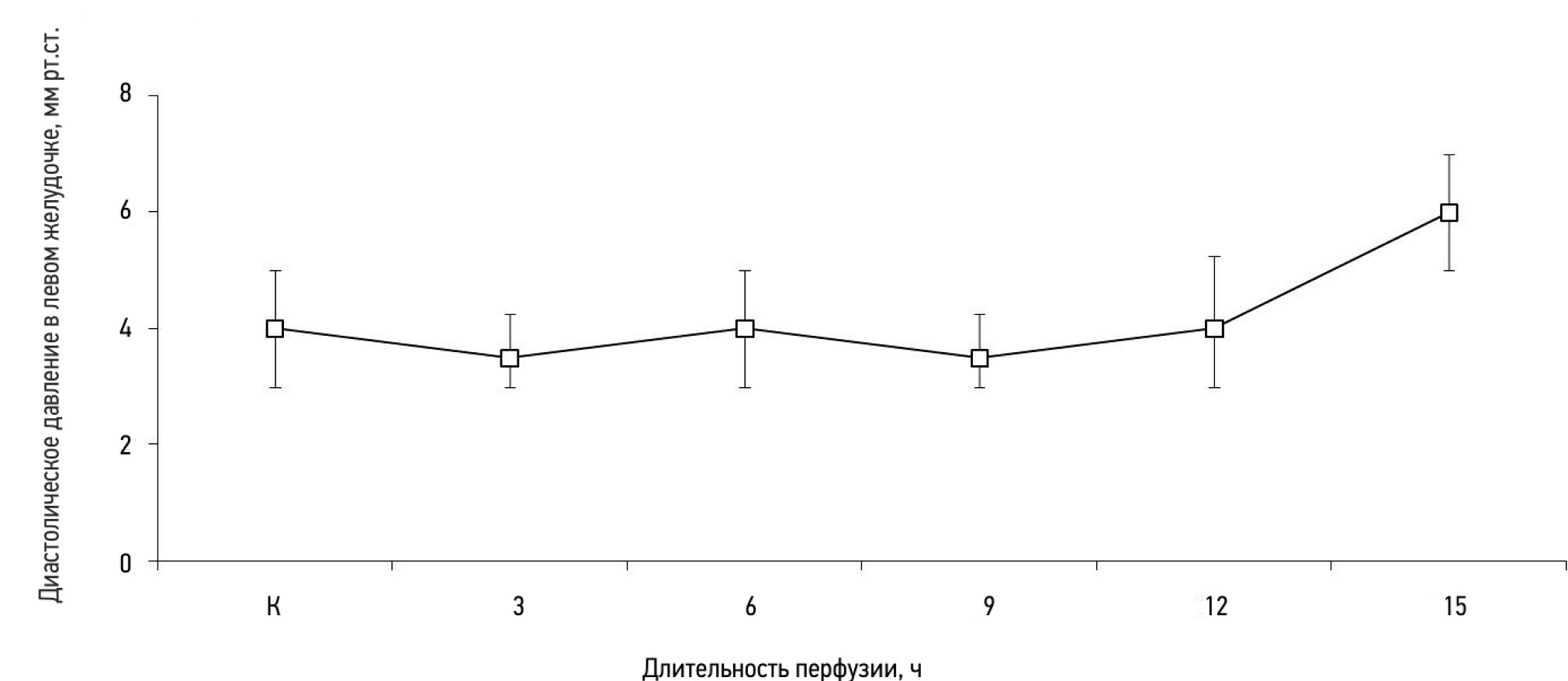 Оценка сократительной функции сердец. После стабилизации функции сердца систолическое давление в левом желудочке (СДЛЖ) составило 96,0 [93, 7; 98, 5] мм рт. ст. и оставалось без значимых изменений в течение 12 часов перфузии. Через 15 часов перфузии наблюдалось снижение СДЛЖ на 15,0% до 82,0 [79, 5; 84, 2] мм рт. ст. (p=0,01208 по сравнению с контролем, рис. 3). После стабилизации функции диастолическое давление в левом желудочке (ДДЛЖ) составило 4,0 [3, 0; 5, 0] мм рт. ст. и оставалось без значимых изменений в течение 12 часов перфузии. К 15 часам перфузии отмечалось повышение ДДЛЖ в 1,5 раза до 6,0 [5, 0; 7, 0] мм рт. ст. (p=0,0164 по сравнению с контролем, рис. 4).