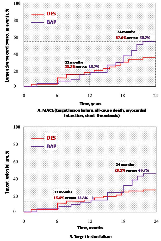 The incidence of MACE in our study was 18.8% vs. 16.7% and 37.5% vs. 56.7% by the end of the 1st and 2nd year of follow-upin the first and second group, respectively (p = 0.25). TLF prevailed in MACE structure, other adverse events did not reliably differ between patients of both groups: MI — 1 (3.1%) and 2 (6.7%, p = 0.21), stent thrombosis — 1 (3.1%) and 1 (3.3%, p = 0.83), non-cardiac death — 1 (3.1%) and 0 cases in patents with DES and BAP, respectively. MACE incidence in the study by H Kawamoto, et al. in general, correlated with our data: 1 (1.8%) and 3 (7.6%) cases of acute MI (p = 0.19), 1 (1.8%) and 1 (2.9%) cases of thrombosis of the stented area, 2 (3.3% and 3.6%) all-cause deaths in DES and DCBC group (p = 0.88) [11].