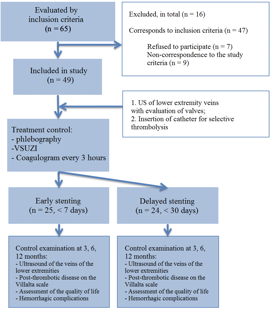 The study was of prospective intervention design. For the primary analysis, 65 patients with proximal venous thrombosis were selected. Later, 7 patients refused to participate in the study. During history taking, 9 patients were excluded because of non-correspondence to inclusion criteria. In result, 49 patients were included in the study (Figure 1).
