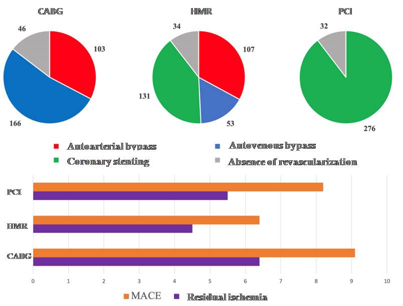 The total volume of performed revascularizations did not differ significantly in groups. In patients in the CABG group, 269 (85.4%) lesions of the coronary artery were corrected, in HMR group 291 (89.5%), in PCI group 276 (89.6%). Anatomically complete revascularization in some situations was limited by objective factors distal or diffuse lesion of the target coronary artery, its intramyocardial course, severe calcification of the coronary artery and aorta, chronic occlusion of the coronary artery with weak contrast of the distal bed, etc. Patients who did not receive anatomically complete revascularization due to objective reasons, were not excluded from our study in order to objectify the results obtained.