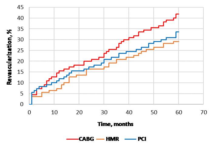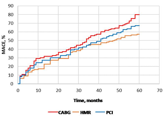 At 5 years, MACE frequency was higher in patients after CABG compared with patients after HMP and PCI 80.0% versus 57.3% (p = 0.001) and 67.3% (p = 0.032). Upon that, the number of MACE cases in the HMR group was lower compared to PCI group (p = 0.127). In contrast, in HREVS study, at 5 years, adverse cardiovascular and cerebral events were more often recorded in the PCI group compared to CABG and HMR 69.4% versus 51.1% and 51.1% (p = 0.033) [16]. In the study by A Hage, et al. (2019), a higher frequency of adverse events after the median follow-up period of 81 [48; 113] months for the CABG group and 96 [53; 115] months for the HMR group was found in patients after CABG, the main contribution was made by survival index 85% versus 96% (p = 0.054) [18].