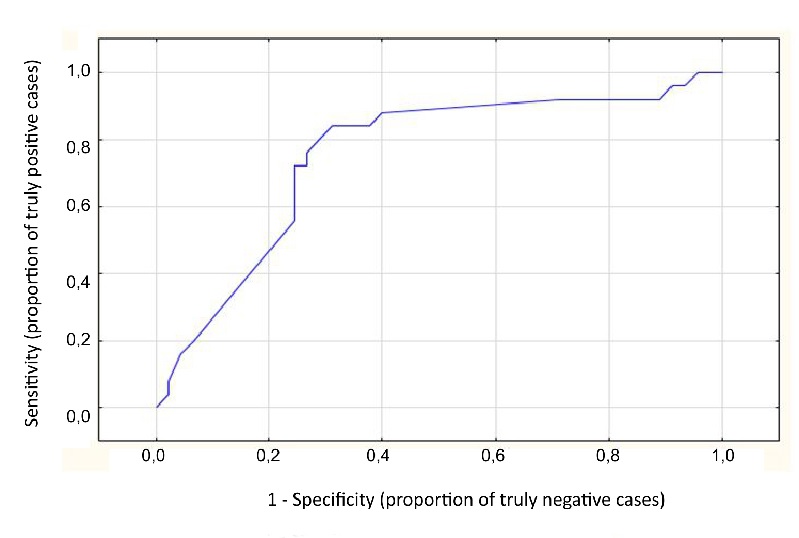 Fig. 1. Graphic presentation of the results of ROC analysis for a neural network using only the physical performance parameter as a predictor: training effectiveness — 71.1%, control effectiveness — 28.8%, test performance — 29.4%, prediction reliability — 75.7%.
