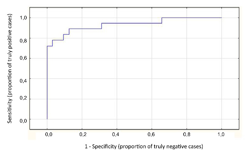 Fig. 3. Graphic presentation of the results of ROC analysis for the neural network (MLP 58-16-2) using all the studied parameters as predictors: training effectiveness — 88.9%, the control effectiveness — 92.8%, test effectiveness — 91.4%, prediction reliability — 96.0%.