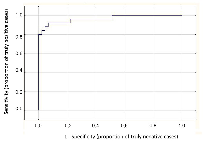 Fig. 2. Graphic presentation of the results of ROC analysis for a neural network using the parameter of physical performance and functional lateralization of the brain as predictors: training effectiveness — 84.1%, control effectiveness — 14.0%, test effectiveness — 15.5%, prediction reliability — 86.0%.