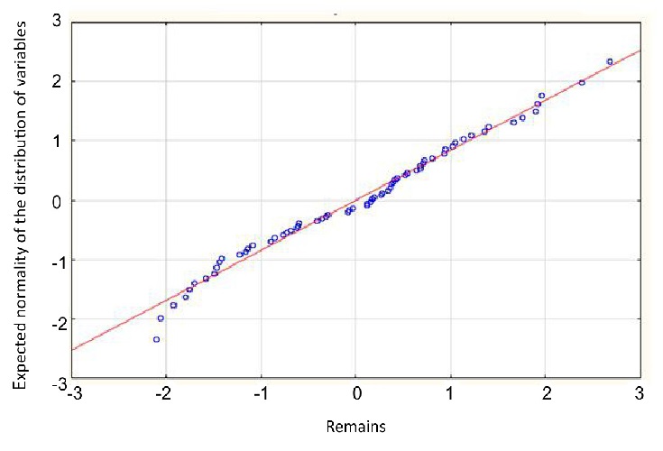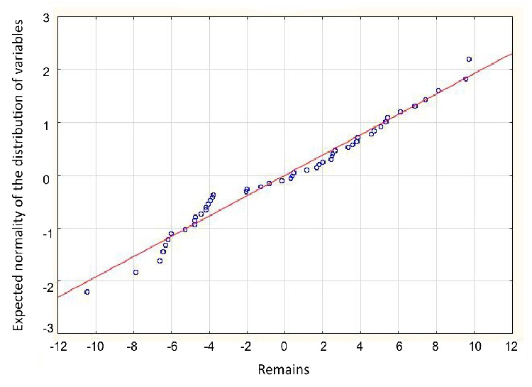 Based on the analysis of variance and the resulting regression model, it was determined that the model with all leading factors is complete. An analysis of the model residuals was conducted, and a standardized regression graph with a scatter of points on the plane was presented, which shows the residuals of the distribution normality of the leading factors. Due to the fact that the scatter of points on the plane of regression coefficients is quite insignificant, it was considered that the constructed model for predicting effectiveness in strength aspect is acceptable. Therefore, the constructed equation allows us to determine the result in strength characteristics (number of times), with the manifestation of maximum efforts with accuracy of 70.8%, since the determination coefficient (R2a) is 0.708 (p ≤0.001, p ≤0.004) (Figure 5).