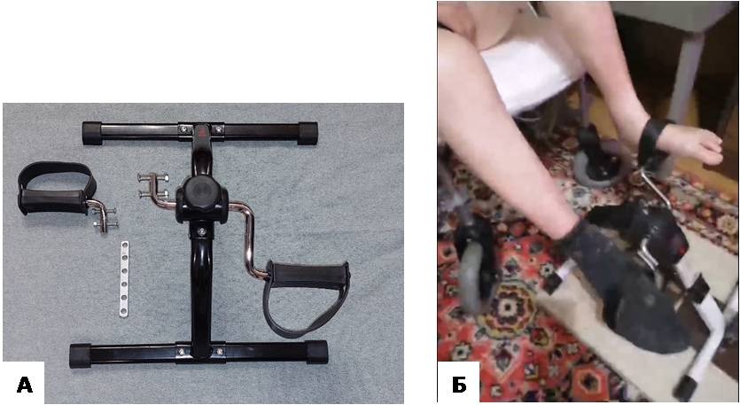 Fig. 2. Mechanotherapy on an exercise bike: (А) exercise bike with the possibility to change the crank length, general view; (B) mechanotherapy at home at the stage of preoperative preparation (the length of the right crank is decreased to reduce the pain of the exercises through decreasing the range of motion in the right hip joint).