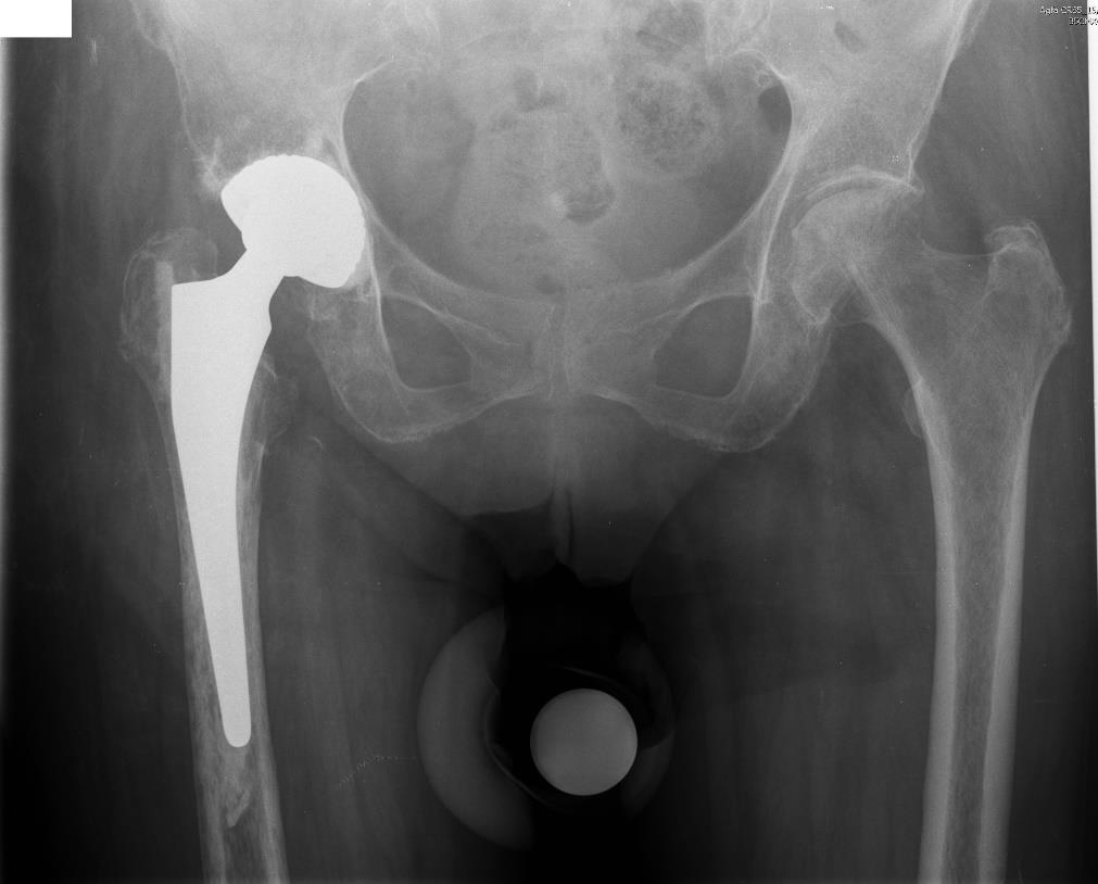 Fig. 3. Postoperative plain radiograph of the pelvis of patient S.: correct position of endoprosthesis elements, uniform cement mantle, the length and offset of the femur almost completely corrected.