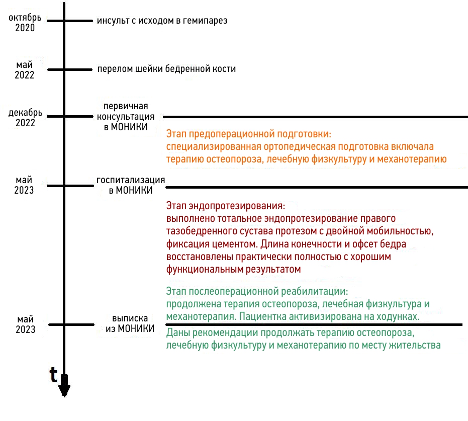 In general, the postoperative period was uneventful and with positive dynamics the patient was successfully activated on a walker after a year of staying in supine position (Figure 4). At the examination at 3 months after surgery, Harris hip score was 53 points. The main stages of the medical history are presented on a time scale of the clinical case (Figure 5).