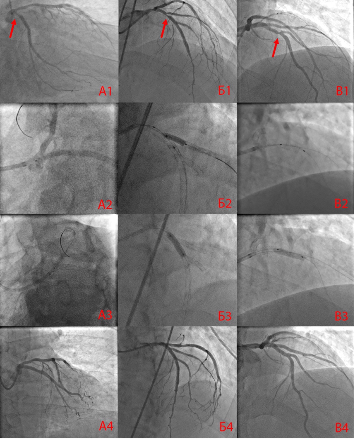 Fig. 2. The immediate result of percutaneous coronary intervention with a one-stent method of correcting bifurcation in-stent restenosis (A1–A4), with a two-stent method (B1–B4) and using a drug-eluting balloon catheter (C1–C4).