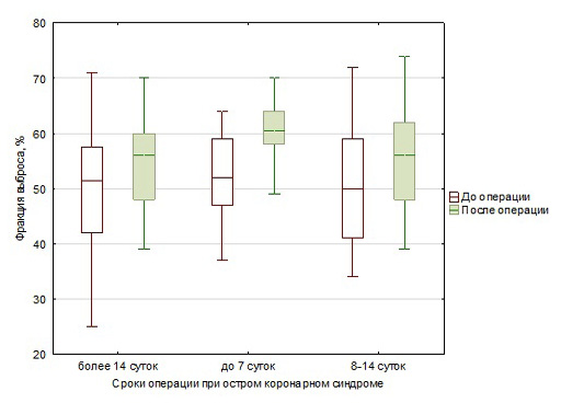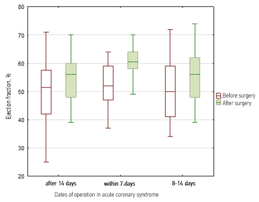 Fig. 1. Dynamics of ejection fraction before and after coronary artery bypass grafting.