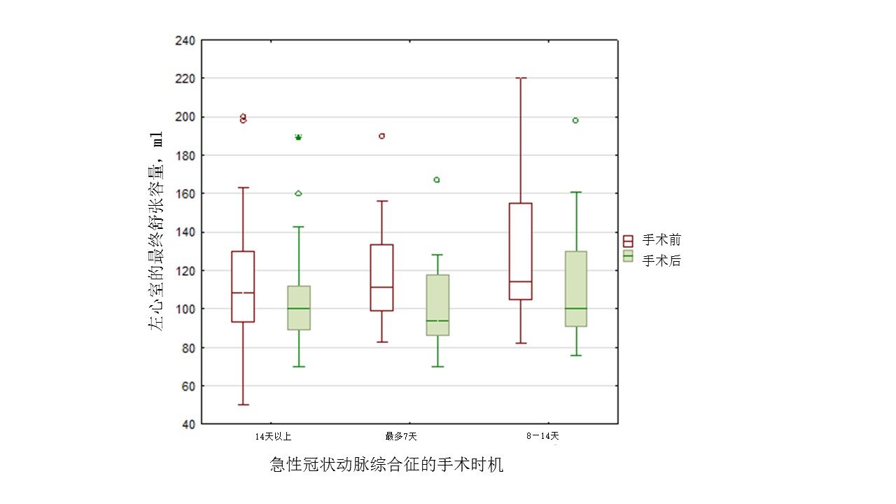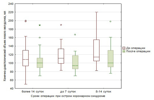Fig. 2. Dynamics of the left ventricular end diastolic volume before and after coronary artery bypass grafting.