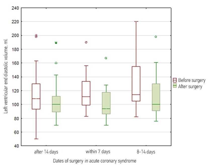 The volumetric parameter evaluation of the left ventricle (end diastolic volume, EDV) revealed an average reduction by 16, 14, and 8.5 ml, respectively, before the operation, which speaks for reverse left ventricular remodeling after the surgical treatment of ACS. At the preoperative level, a reliable difference was determined in this parameter between groups 2 and 3. In the postoperative period, no statistically significant differences were found between the groups (Table 5, Figure 2).