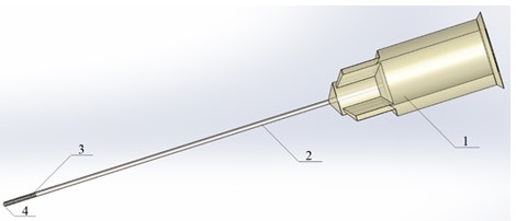 Fig. 1. Modernized endodontic needle: (1) cannula; (2) needle body; (3) side holes; (4) apical hole.