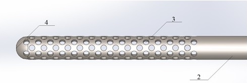 Fig. 2. 3D model of the needle with the precise location of holes: (3) side holes and (4) apical hole; front view.