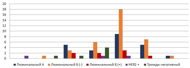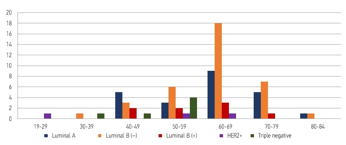 The main group (n = 84) was predominated with BC of different stages (I and II: 28.7% in each, III: 42.8%) of different phenotypes, as well as one case of melanoma metastasis and one sarcoma breast metastasis. Here more aggressive phenotypes of BC were more common in young patients (Figure 1).