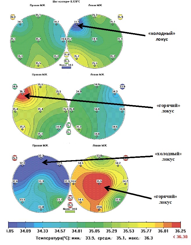 The studied parameters were assessed on RТМ 01 РЭС computerized diagnostic complex consisting of internal temperature meter, IR skin temperature meter, a means for visualization, processing, and analysis of the obtained information by the expert system [24].