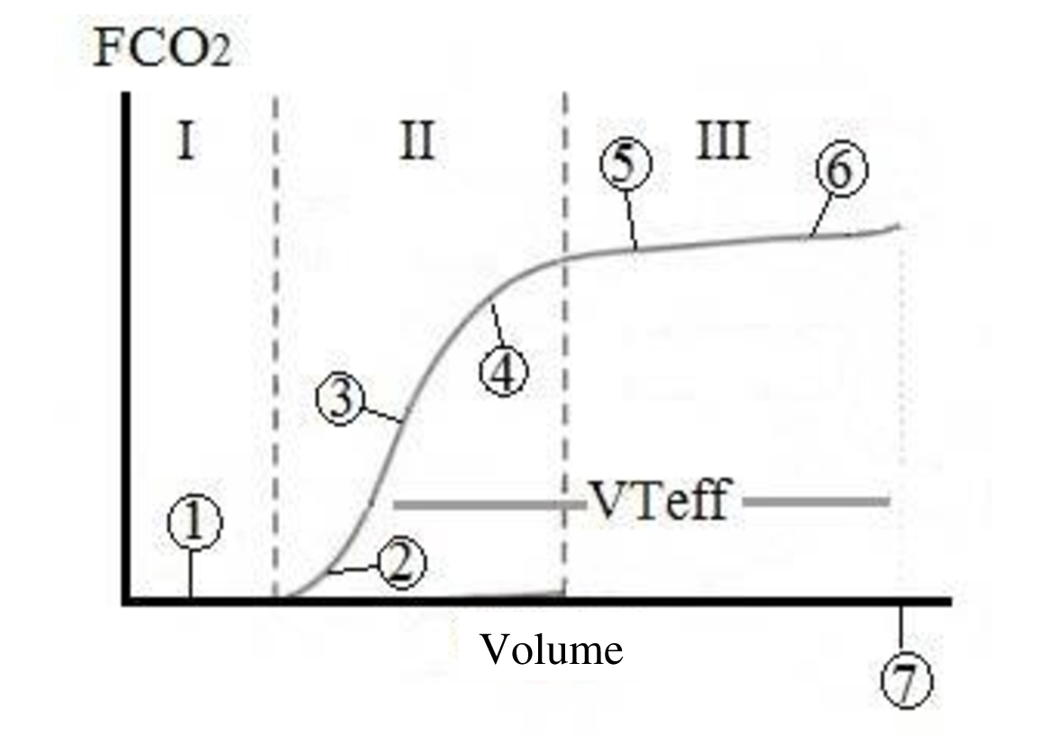 Phase I characterizes CO2 of the anatomical dead space, that is, the gas of the upper airways which contains little amount of CO2 (usually compared to zero) and is used in resuscitation practice to calculate the dead space of the breathing system [11].