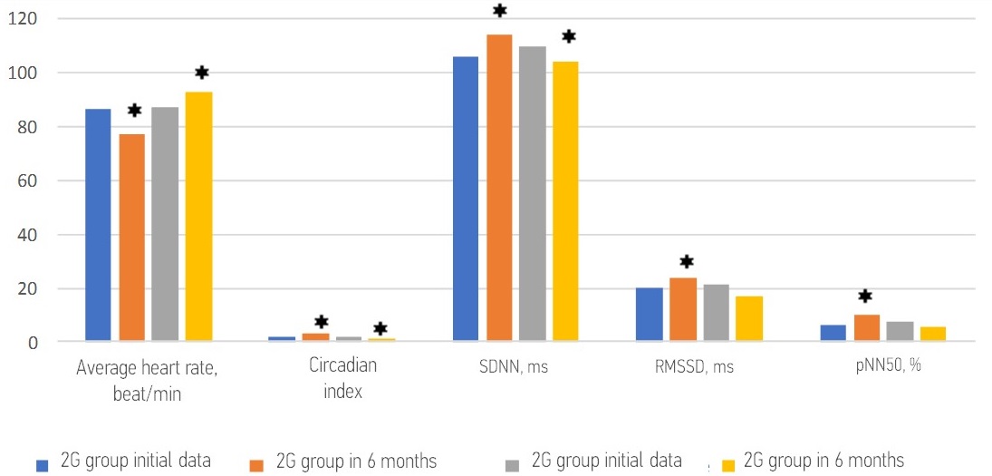 Fig. 1. Dynamics of parameters of heart rhythm variability in patients of 1G (receiving empagliflozin) and 1C (continuing the earlier selected treatment) groups in 6 months of treatment.