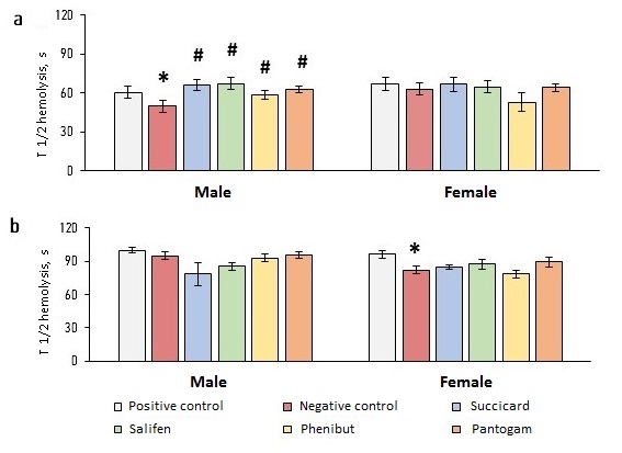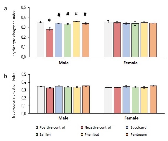RESULTS: In 8-month-old male offspring of rats with EP, a shorter time of achievement of half the maximal amplitude of erythrogram was noted in acid hemolysis relative to the positive control group, and the erythrocyte elongation index was reduced. Relative to the negative control group, Succicard®, Salifen®, Phenibut®, and Pantogam® promoted the prolongation of hemolysis and the erythrocyte elongation index in 8-month-old male rats in the experimental groups. In 14-month-old male and female rats of different ages, no statistically significant differences were found between the groups.