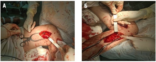 In prosthetics of the PA due to an aneurysm, we use two approaches — medial (along the medial surface of the upper one-third of the lower leg) and posterior (through the popliteal fossa in the projection of the PA). If an aneurysmectomy is necessary, priority is given to the posterior access. Indications for aneurysmectomy include compression of the tissues surrounding the aneurysm (nerves or veins) and a large-sized aneurysm (more than 3.5 cm in diameter). In cases where only the artery is involved in the pathological process, it is possible to limit the intervention by ligating the aneurysm above and below the aneurysmal sac using the medial access approach.