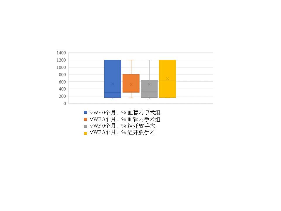 介入前和介入后3个月血管内和开放手术组患者的vWF活性所示如图2。