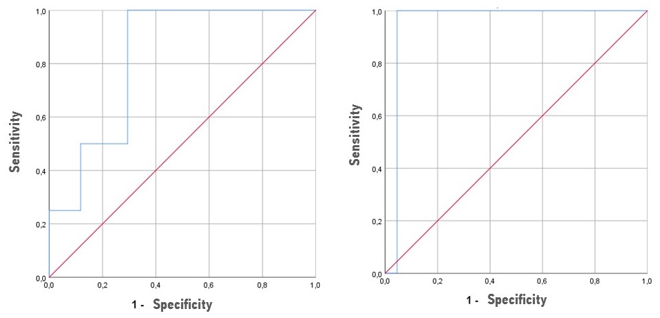 A组死亡为4例(17.3%),B组死亡为2例(8.0%)。根据ROC分析结果(图 1),确定两组死亡的预后因素。A组AT III活性低,死亡概率增加(AUC 0.824±0.096,95% CI 0.635—1,p=0.049), AT III活性阈值为98.30%。B组FIX活性高,死亡概率增高(AUC 0.955±0.044,95% CI 0.868—1,p=0.037), FIX活性阈值为129.15%。