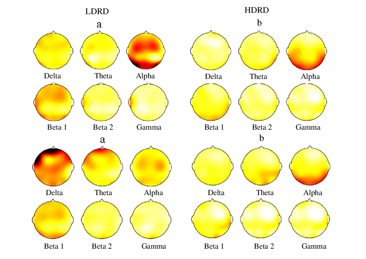Fig. 1. Examples of spectral patterns of EEG typical of left-handed individuals with LDRD and HDRD at rest (a) and in tension of muscles of the left leg (b)
