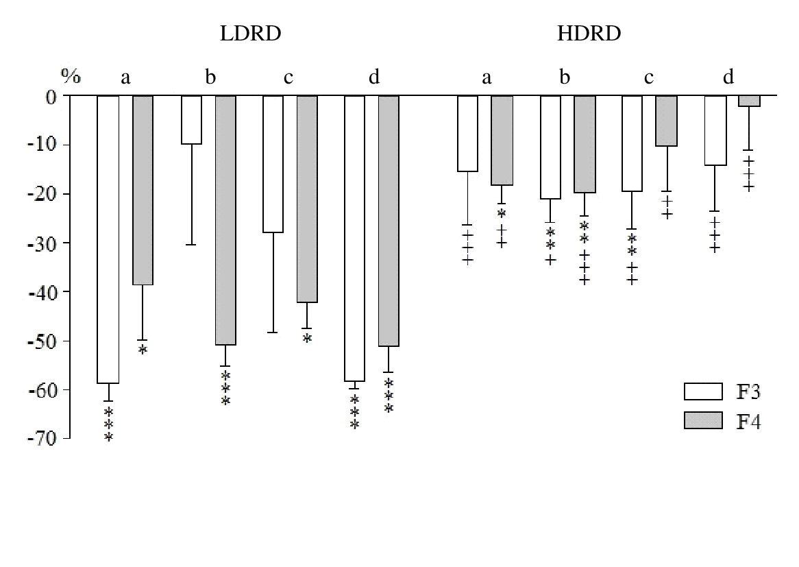 Fig. 2. Alteration (in % relative to rest) of the amplitude of murhythm in F3 and F4 leads in left-handed individuals with LDRD and HDRD in motor tasks (a – imagination of action with the right leg, b – imagination of action with the left leg, c – real action with the right leg, d – real action with the left leg).