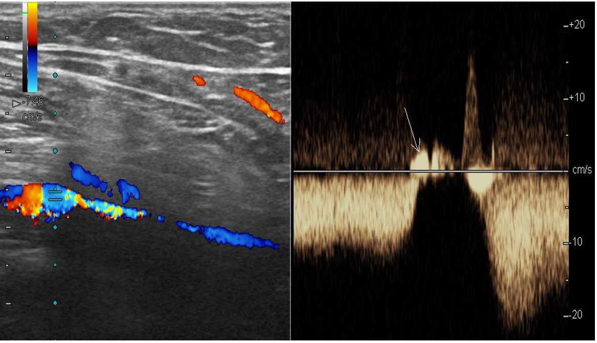 Fig. 1. Sonogram of deep shin vein, USDS. Performed with distal compression test. Retrograde blood flow is recorded