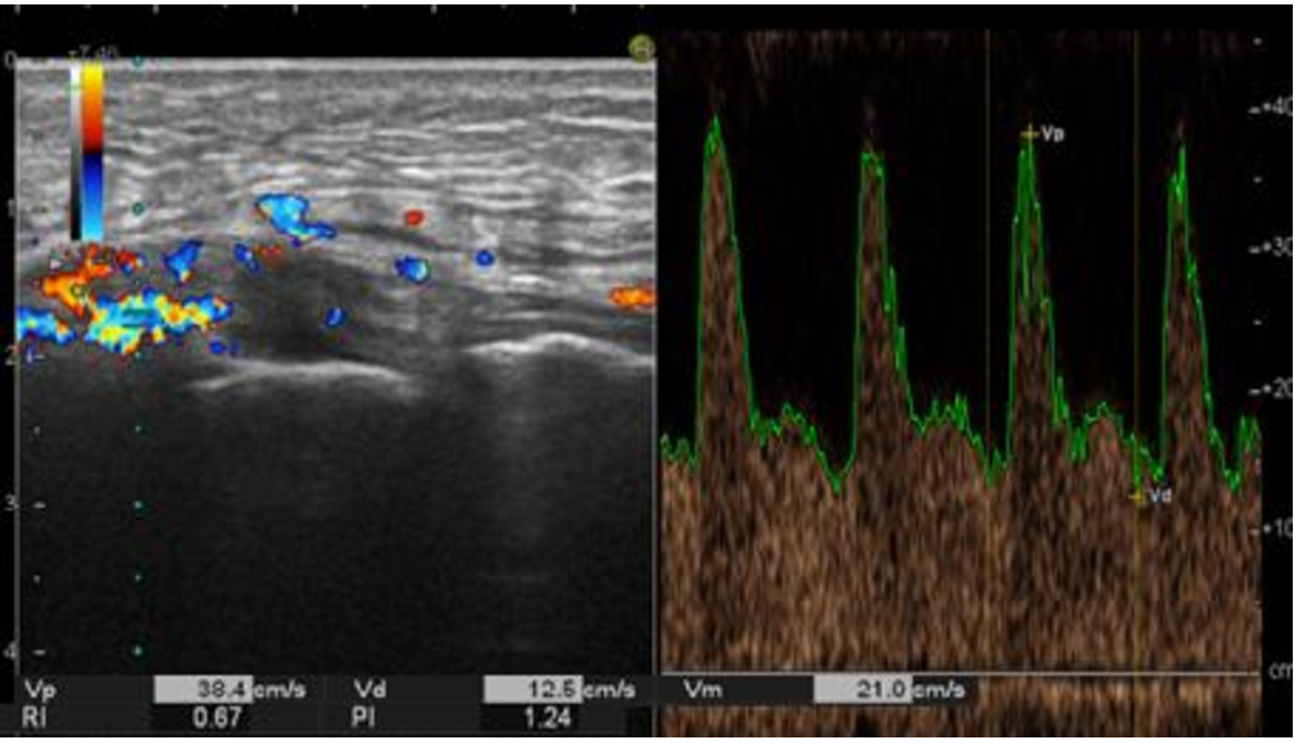 Figure 2 shows a sonogram of the medial part of knee joint in the frontal plane in 2 days after arthroscopic reconstruction of ACL. In longitudinal scanning, thickening and edema of synovium were determined in the projection of the lateral subligamentous space of the knee joint. Doppler scanning showed a local hypervascularization of the studied zone, the mean linear blood flow velocity (Vm) made 54.6% of the peak linear velocity (Vp), which was interpreted as evident vasodilatation of vessels.