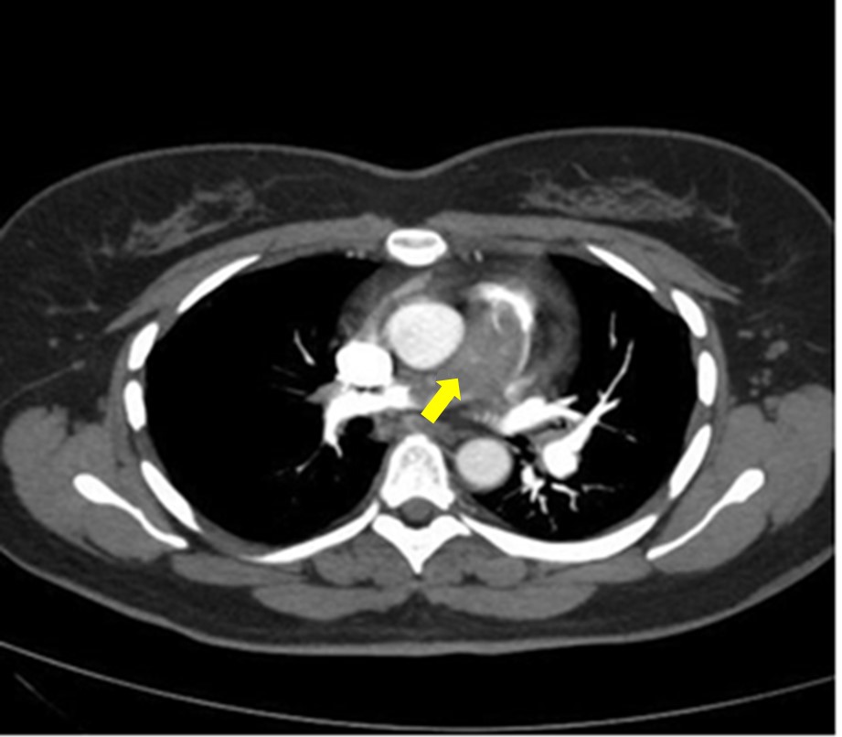 Note: the arrow indicates a thromboembolus in the trunk and bifurcation of the pulmonary artery.