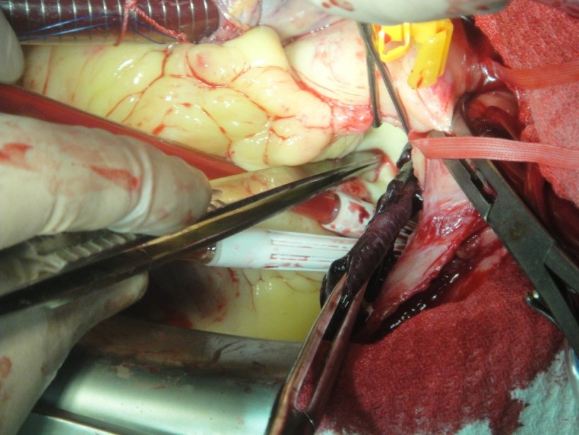 After preoperative additional examination and stabilization of parameters of central hemodynamics, patients of group 1 underwent an urgent surgical intervention within 1.12 ± 0.45 hours from the moment of admission to hospital. A surgical access was longitudinal median sternotomy. To improve visualization of the right heart chambers, a wide T-shaped opening of the pericardium was performed, after which a heart-lung machine (HLM) was connected through isolated cannulation of the orifices of the superior (SVC) and inferior vena cava (IVC) with 32F and 36F cannulas, respectively, and also of the ascending aorta.