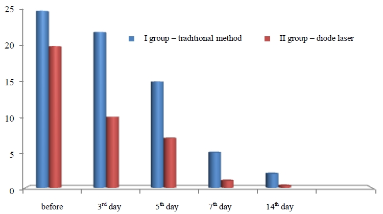 The obtained results corresponded to changes in the area of wound surface depending on the kind of surgical intervention. Thus, on the 3d day the wound surface area in patients of II group twice decreased, and on the 5th day reduction in the wound surface area continued. Epithelization of postoperative wound was observed on the 7.0th ±0.5 day due to complex antibacterial, antiinflam-matory and stimulating effects of laser radiation on regenerative processes [3, 4, 8].