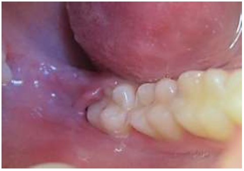 Clinical case 1. A female patient S., 21 years old, applied to the outpatient clinic with complaints of periodical pain, restriction in the opening the mouth, discomfort in the region of the third lower molar on the right, permanent biting of the mucous membrane with the upper molar within half a year. On examination the mucous membrane was locally hanging over the distal lingual cusp of 4.8 tooth, which erupted to 3/4 of its crown out of the alveolar socket. The antagonist tooth completely erupted. At the moment of examination, no signs of inflammation were seen on mucosa of the retromolar region (Fig. 3). On X-ray examination, 4.8 tooth was in the dental arch. The mouth opened to 3.5 cm. The diagnosis: pericoronitis in the region of 4.8 tooth, half-impaction of 4.8 tooth. The patient was made operation of operculectomy with a diode laser under infiltration anesthesia. The hanging mucous membrane was excised in the pulsed-periodic mode with 0.7 W radiation power (Fig. 4). Postoperative period ran without complications, epithelization occurred on the 10th day.