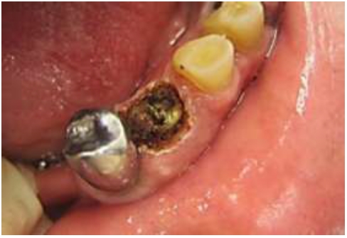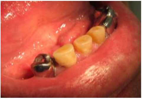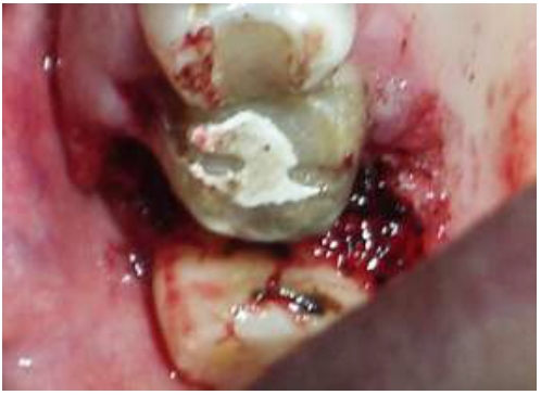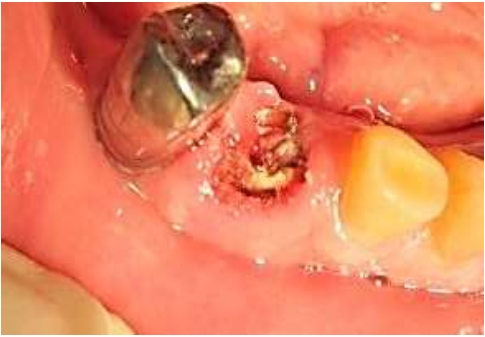 Fig. 6. A view in the mouth cavity after removal of the crown part of 4.2 tooth with the diode laser