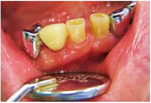Clinical case 2. A female patient D., 82 years old, was directed from the orthopedic department for elongation of the clinical crown of 4.2 tooth (Fig. 5). On examination: fracture of the crown part of 4.2 tooth. Under infiltration anesthesia the crown part of 4.2 tooth was extracted (Fig. 6) and gingivectomy was conducted with the diode laser in pulsed-periodic mode with 0.7 W radiation power (Fig. 7). The contour of the gingival edge recovered. After that an orthopedic structure was fixed in the mouth cavity. In the postoperative period no complications were observed. In the postoperative period formation of the optimal esthetic contour of the gingiva in the region of surgical intervention was noted (Fig. 8).