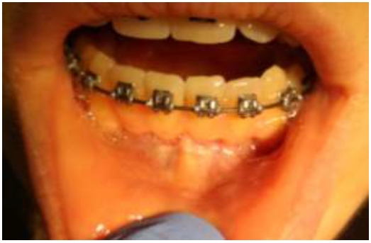 Clinical case 3. A female patient M., 20 years old, was directed from orthodontic department for plasty of the frenulum of the lower lip. On examination: high attachment of the frenulum of the lower lip, recession of the gingiva in the region of 4.1, 3.1 teeth (Fig. 9).