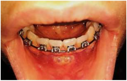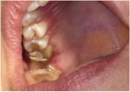 Fig. 9. Shortened frenulum of the lower lip before the operation