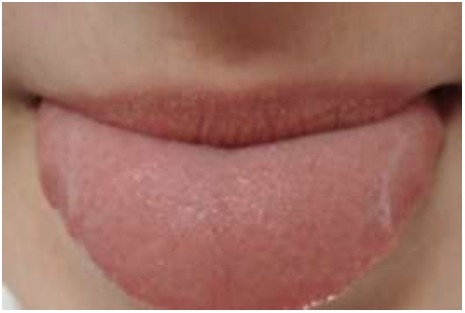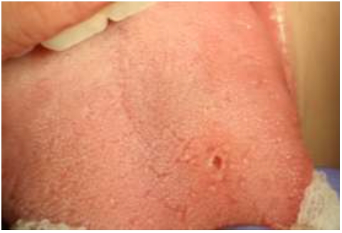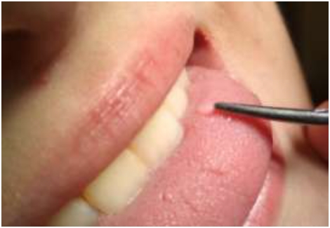 Clinical case 4. A female patient D., 19 years old, referred to the outpatient clinic with complaints of the neoplasm on the tongue. Anamnesis: the patient noticed formation about 1 month before and noted its slow growth. On examination of the mouth cavity a neoplasm of round shape 0.3 cm by 0.3 cm in size on a narrow base was seen on the left part of the anterior third of the tongue (Fig. 13); it was soft, painless and mobile to palpation. Clinical diagnosis: papilloma of the tongue.